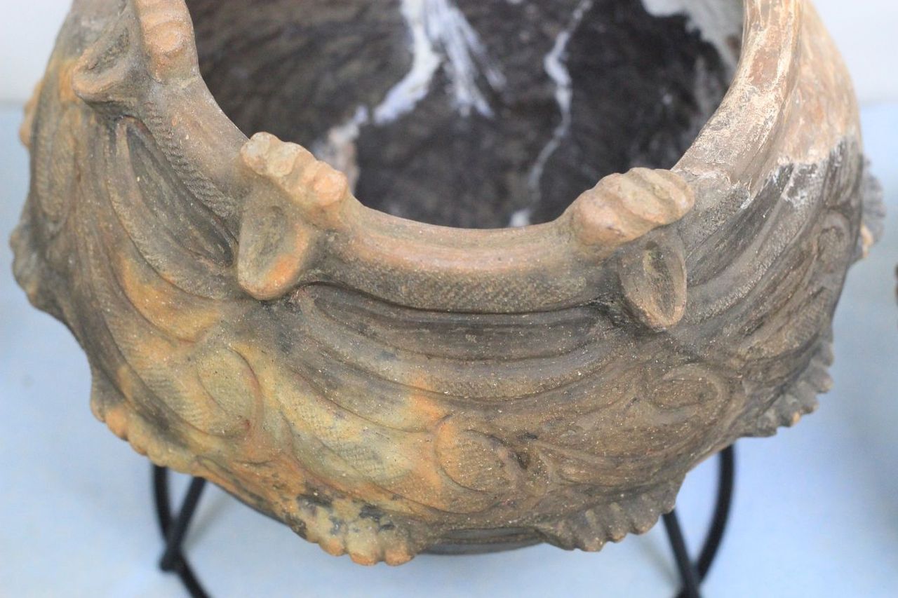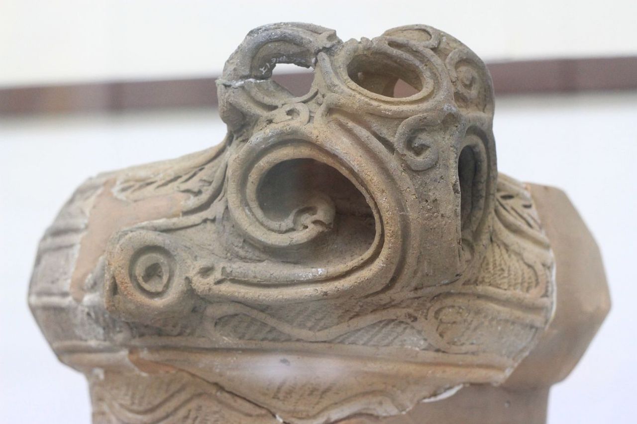 展示されている土器を上から覗くと、土器の中に何かを入れた袋が入っています。倒れたりしないように重しを入れているのでしょうか?