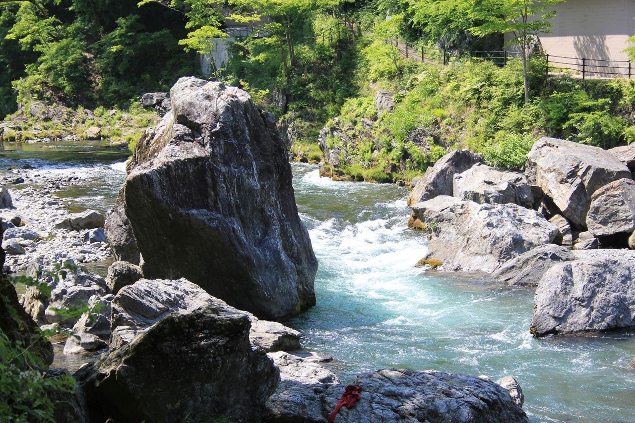 急流の白と青とが石削る