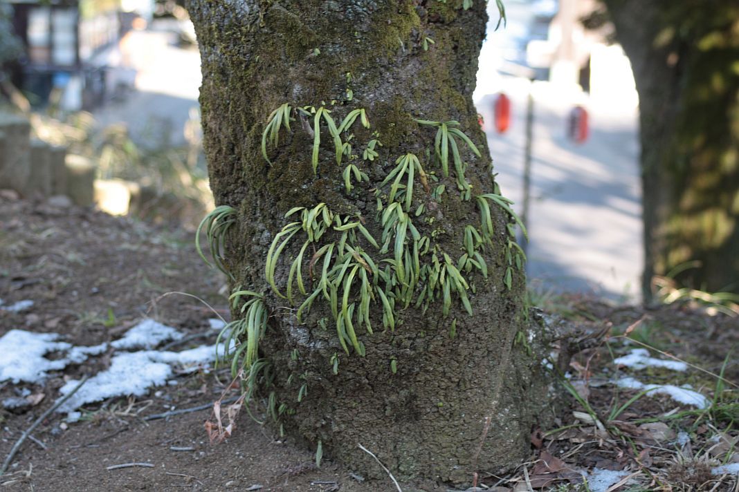 産道の残雪と、松に寄生する常緑の葉のコントラストが命を感じさせます。