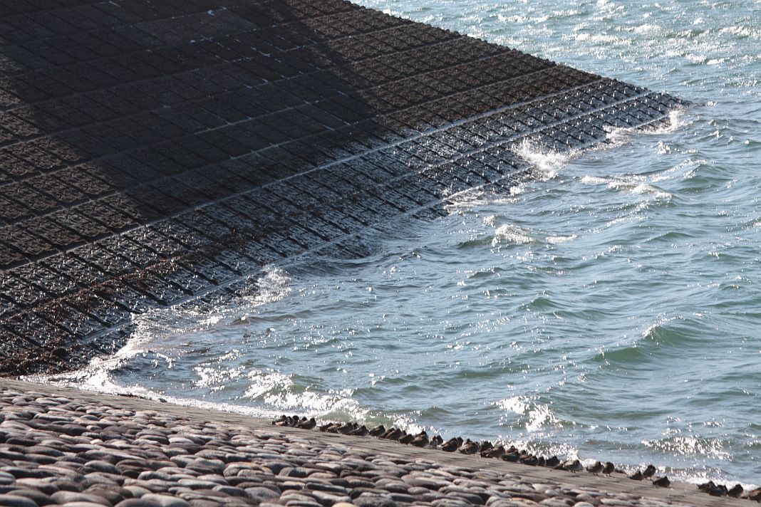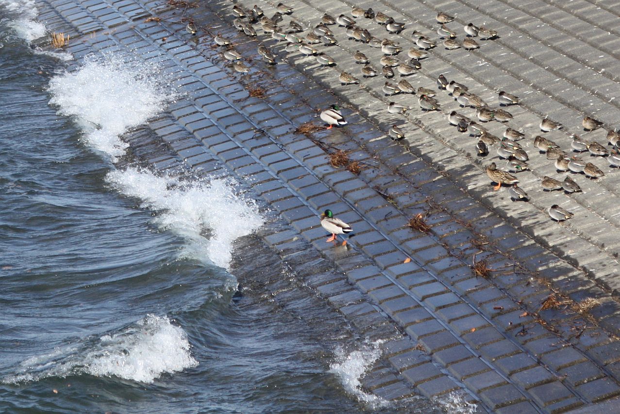 波が打ち付ける堤には、陸に上がり首を羽の中に入れて風の冷さから身を守っている鴨さんもいます。