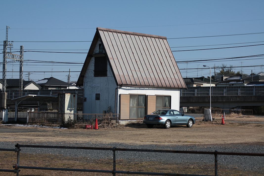 狭山の丘陵を下って帰ります。この家は、バブルの地上げに抵抗して残った一軒屋でしょうか。急勾配の屋根が山小屋風でもあります。何時見ても奇妙な印象を受けます。荒れ果てた地に残る、バブルの嵐に生き残った一軒屋。どうしてもそんな印象なのです。