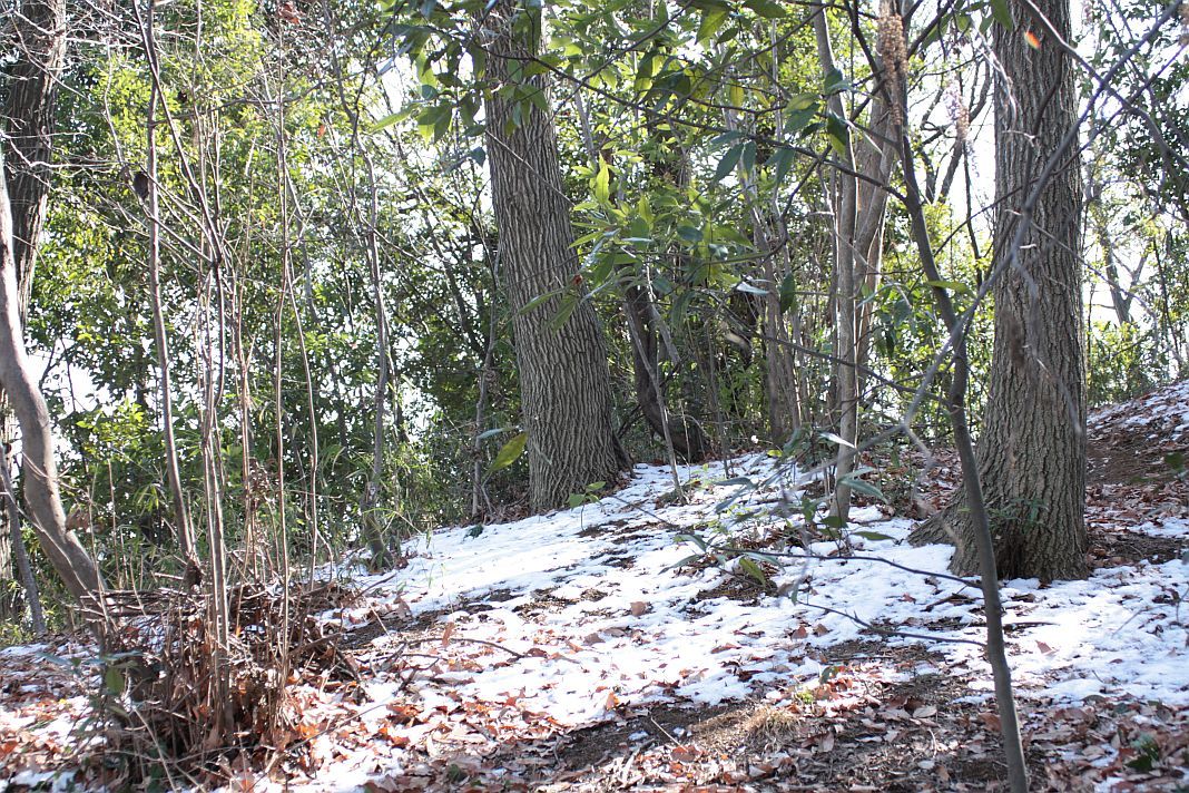 トトロの森には雪が残っています。靴底にどっかり雪解けで湿った土が付いて歩きにくい!足元注意です。