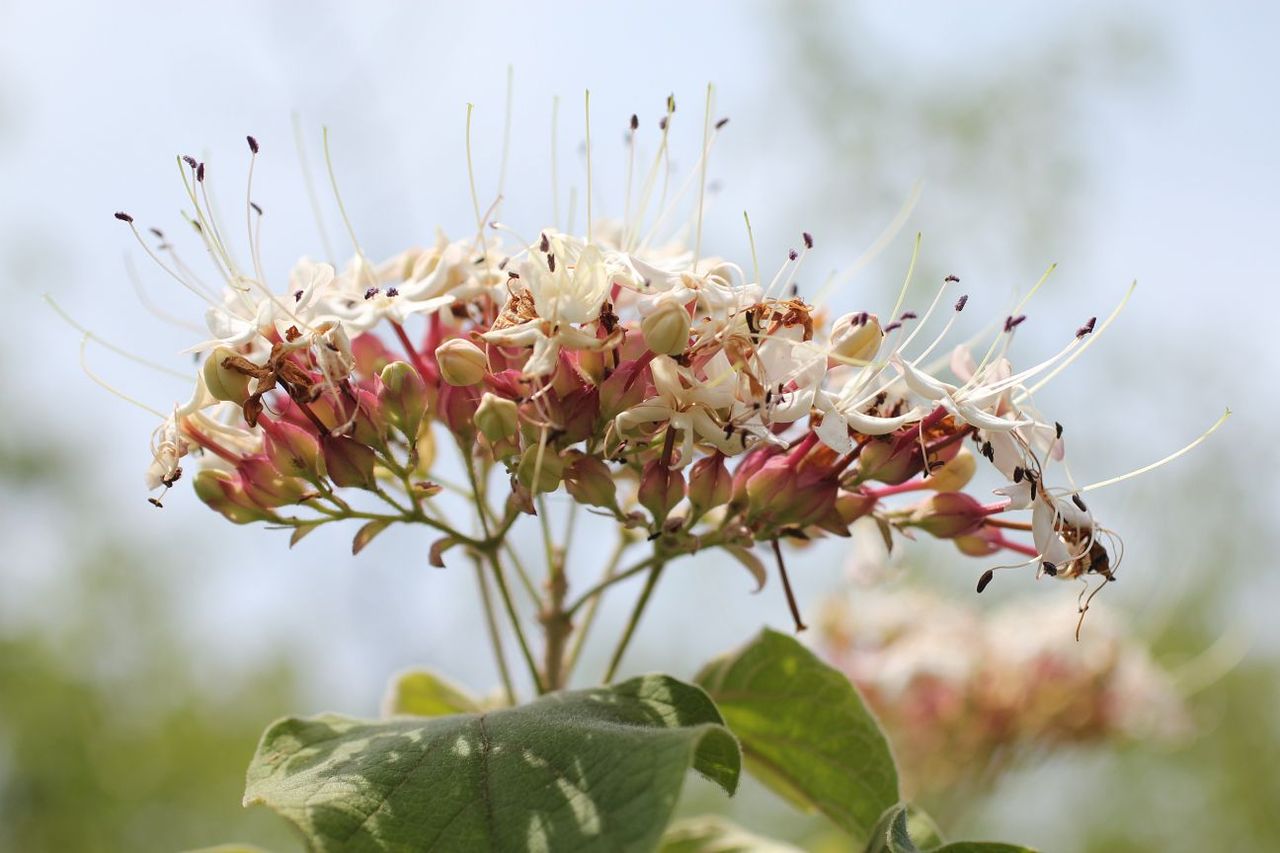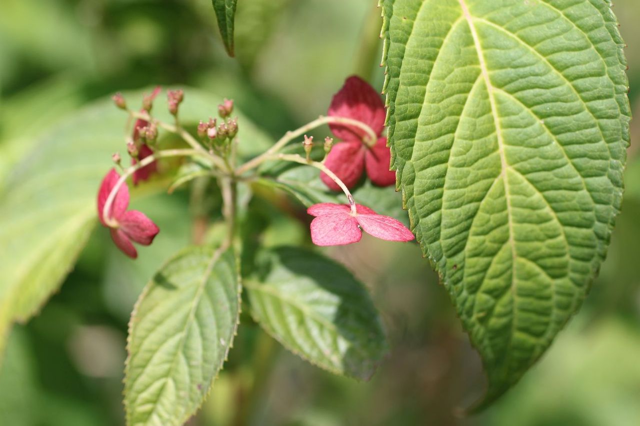丘を下っていくと、様々な花に出会えます。大きな葉の日陰でまだ色づいている紫陽花もありました。