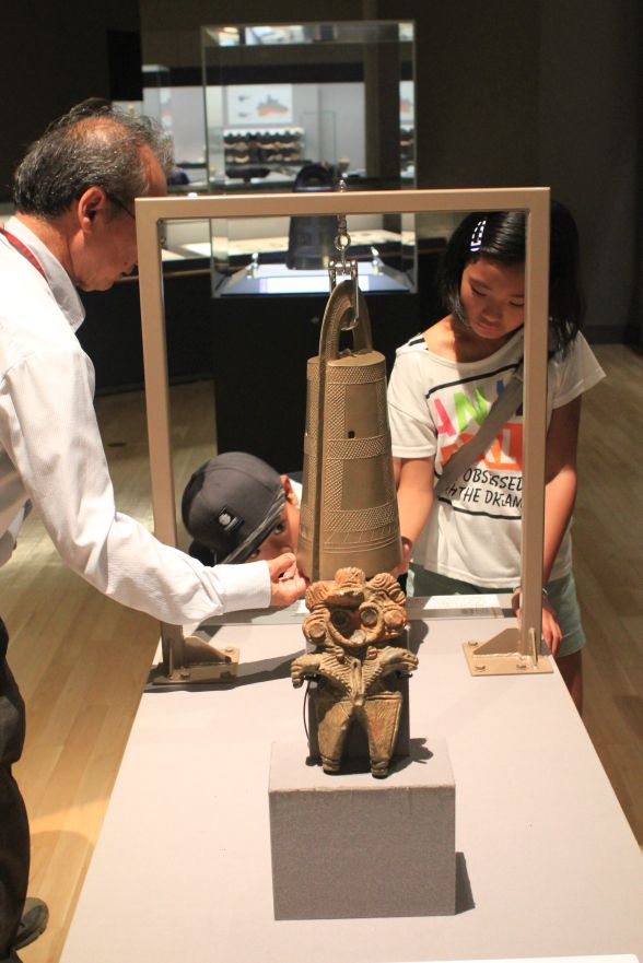 触るコーナーでは、ボランティアの方が子供達に話しかけています。夏休みですね。そうそう、さわれる土偶(複製)がみみずくに戻っていました。