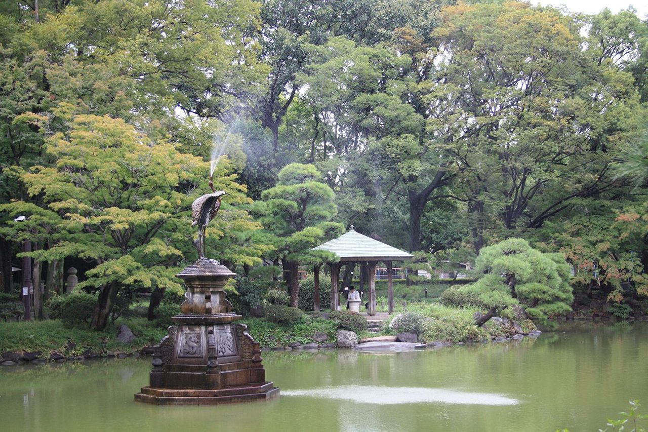 雲形池の鶴の噴水が、プワ〜と雨を逆流させています。