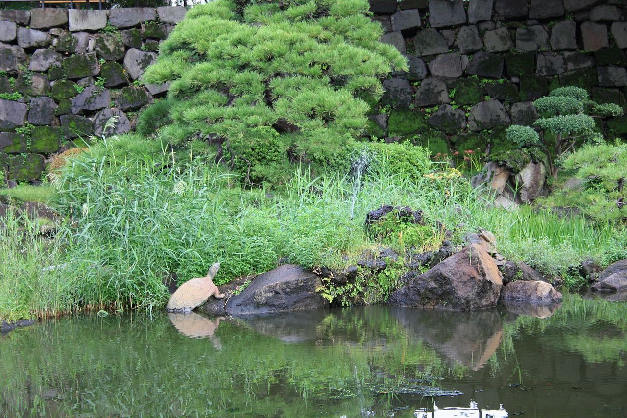 日比谷公園の心字池。とても大きな亀君が、岩に登ろうとしています。でも・・・いつまでたっても少しも動きません。