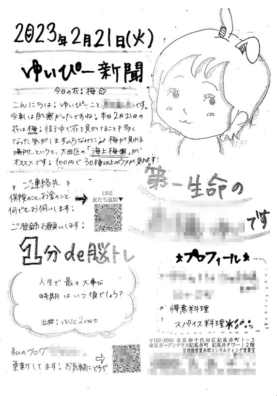 親しみやすい呼びかけ。「入り」は、季節の話題。定番だ!そして、この場では商談などできない。いきなり面談は、最近の若者は忌避するから、気軽にLINEで繋がる。楽しく繋がれるかもを期待させるプロフィール。ポイントは、得意料理は男性社員の心を掴む?さらに、面白話で自身のブログに連れ込む魂胆。流石だな〜〜〜。