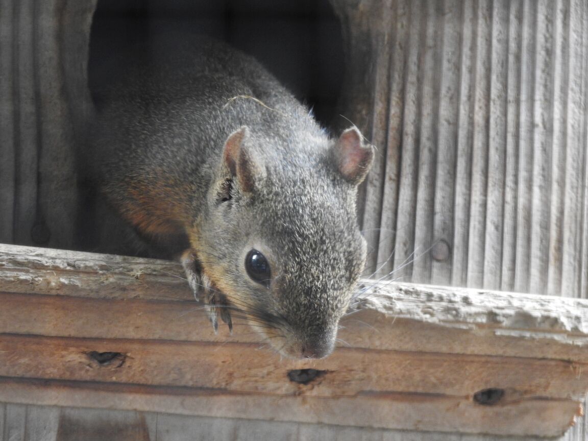 リスさんは珍しく巣箱の中から顔を出してました。リスさんは暑くても平気なのかな〜?