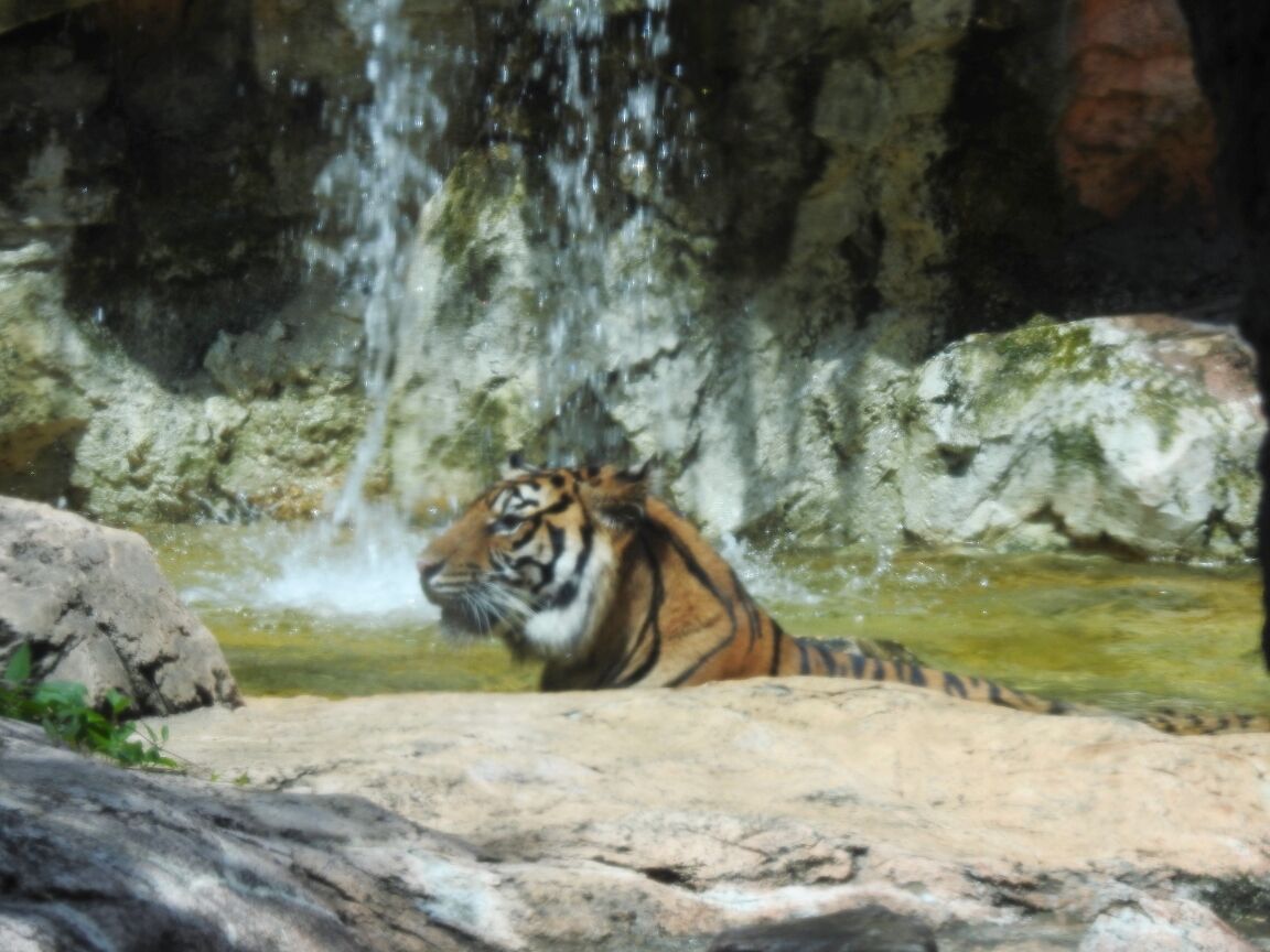 虎さんもへばってます。ウロウロがノロノロで … 小滝の池に水浴びに入っちゃいました。猫科なのに … 。虎の水浴び。初めて見させてもらいました。