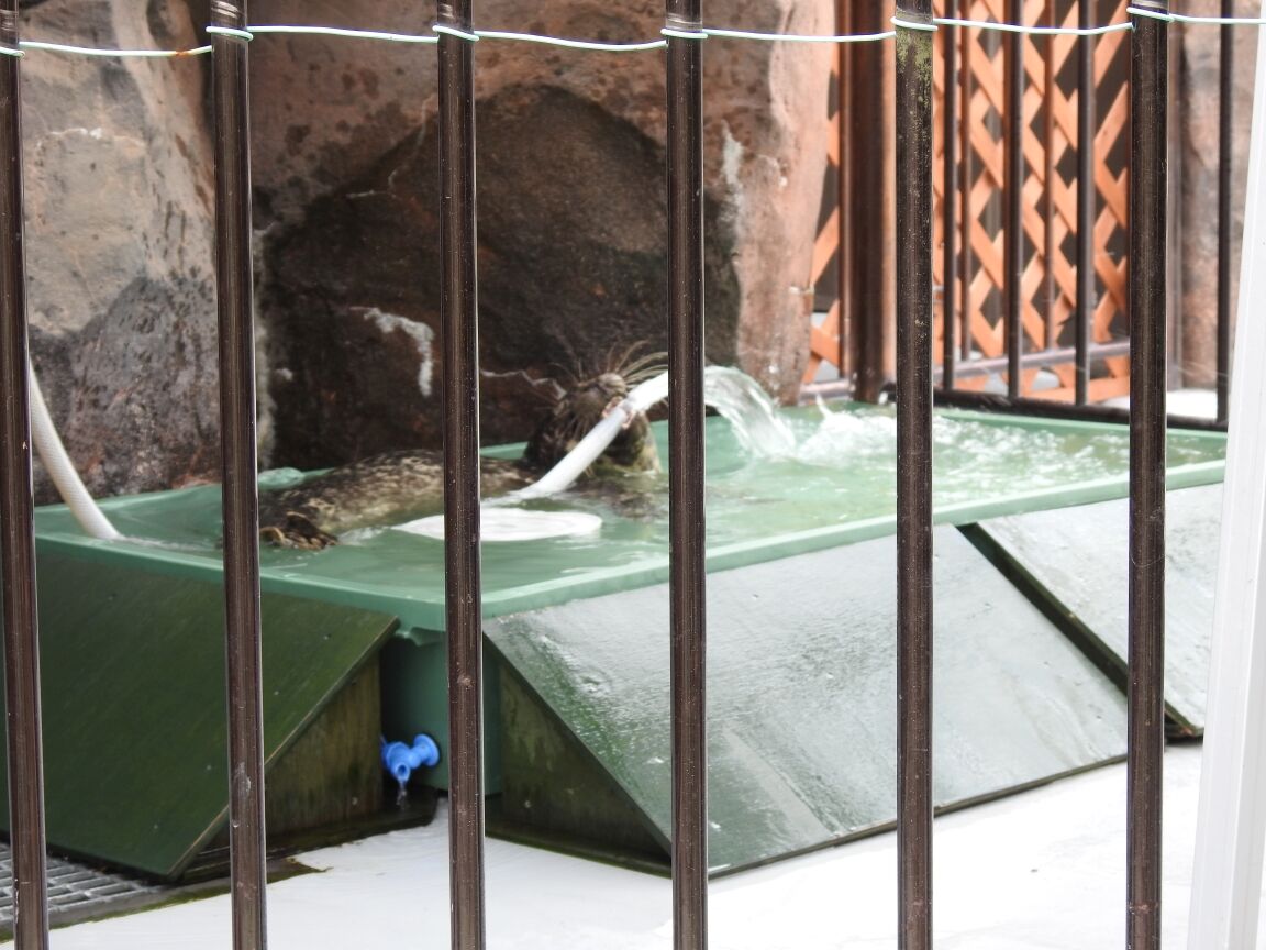 「2023年4月8日にゼニガタアザラシの子供が生まれました」の張り紙。見ればホースを咥えて元気に遊んでいる子供。元気に育って欲しいものです。