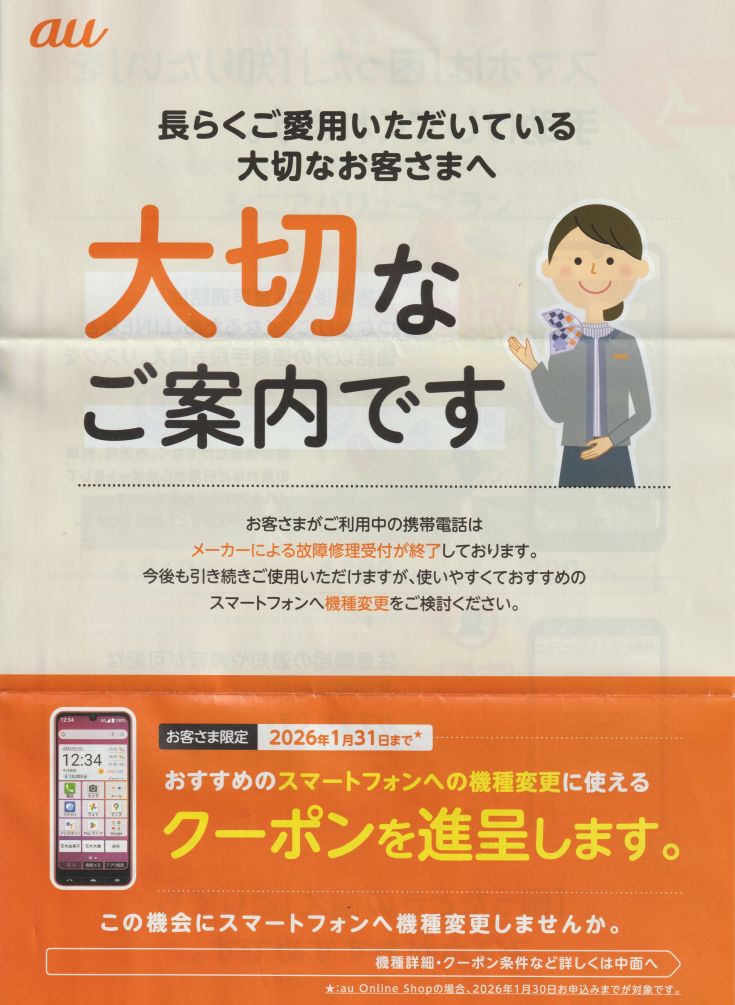¡¡µîǯ¡¢au¤«¤é¤Î¤´°ÆÆâ¡£¡ÖĹ¤é¤¯¤´°¦ÍѤ¤¤¿¤À¤¤¤Æ¤¤¤ëÂçÀڤʤªµÒÍͤءפȤ¤¤¦¡Ö¥¥ã¥Á¡×¤Ë¡ÖÄϤޤì¡×¤Þ¤·¤¿¡£½÷˼¤Ï¡ÖÀ§È󡪥¹¥Þ¥Û¤ËÂØ¤¨¤Æ¡×¤ÎÇ®Îõ¥³¡¼¥ë¡£»ä¤¬¥¹¥Þ¥Û¤ËÂØ¤¨¤ì¤Ð¡¢½÷˼¤â¥¤¥í¥¤¥í½õ¤«¤ë¤ó¤Ç¤¹¡£