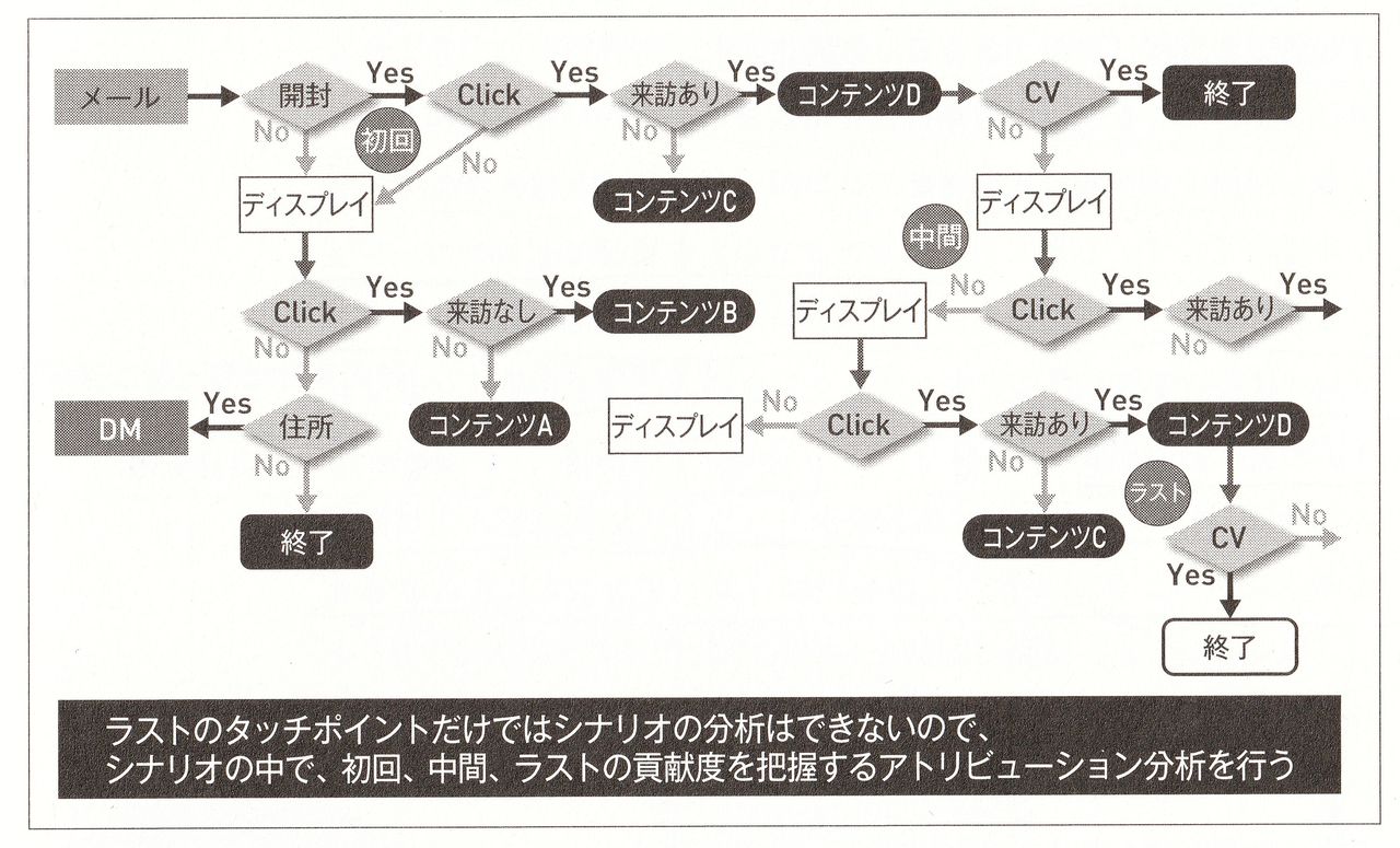 メールでキャンペーン内容を配信します。メールを開封する人/しない人に分かれます。メールを開封しない人には、ディスプレイ広告を配信します。ディスプレイ広告をクリックする人/しない人に分かれます。クリックしない人のCRMデータを確認し、住所データがあればDMを送ります。住所データのない人のシナリオは終了します。