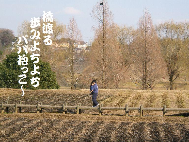 春になったら花が咲き乱れる木の回廊をヨチヨチ歩いていた女の子がお父さんに抱きつきました。可愛い!(^^)!