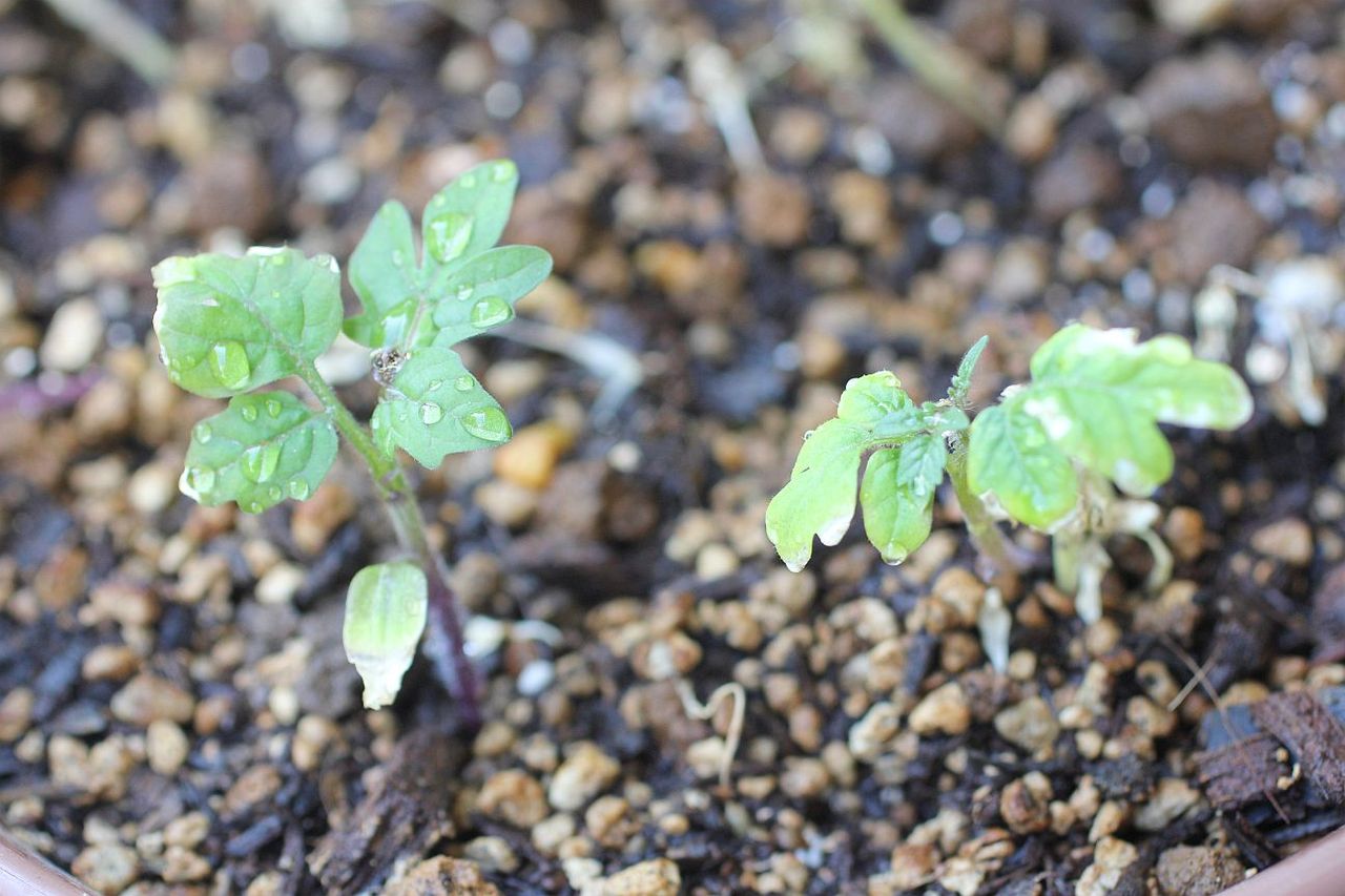 ポマトの苗 ベランダに鉢植えを戻します。ローズゼラニウムは、大きくなっていますが、花のつきが悪いので・・・どうしようか、迷っています。姫檜扇水仙は、日照不足のためか枯れてしまいました。代わりに、娘が持って来たポマトを植えてあります。育つといいな〜。