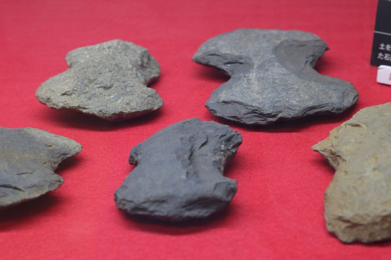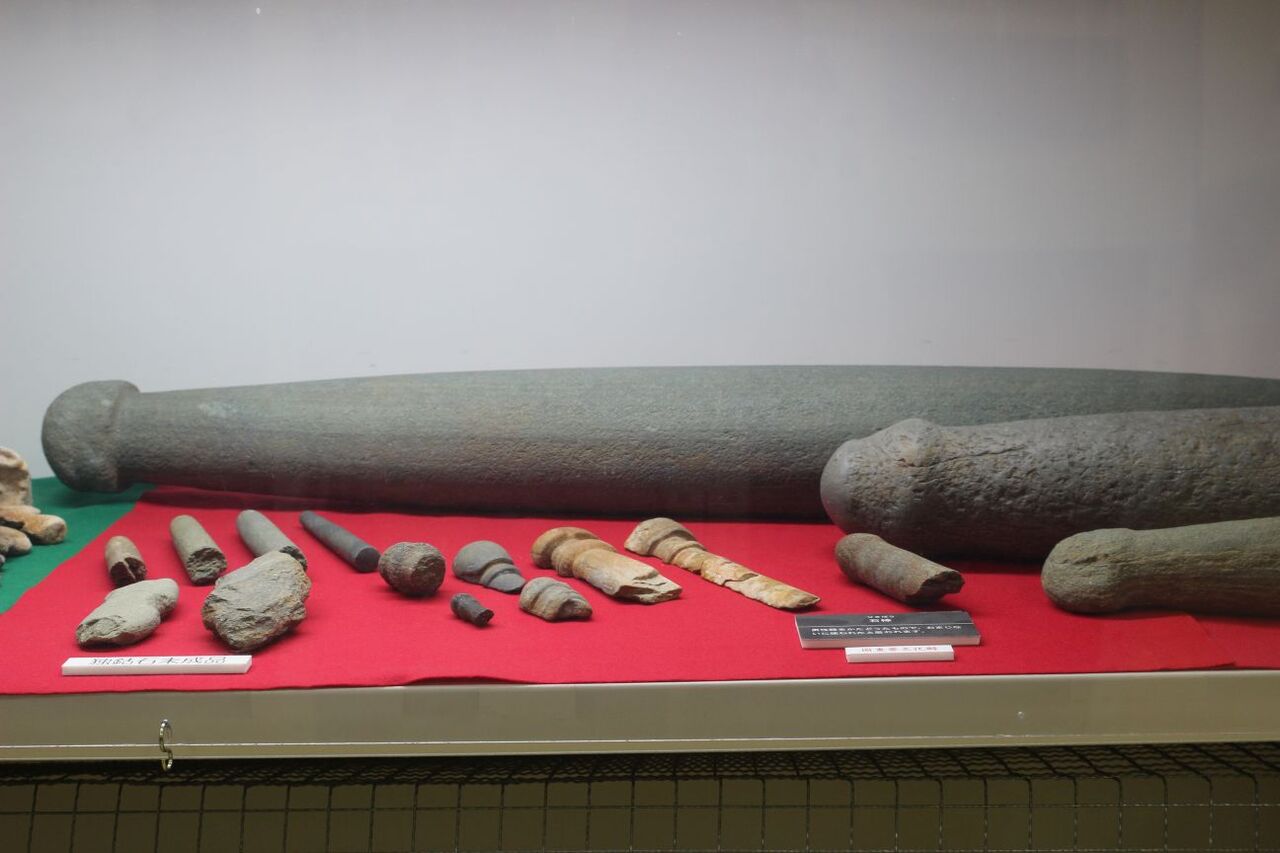打製石斧と石棒。石棒は、勿論!男性器をかたどったもの。硬くて大きくて立派だな〜。負けそう! ← 勝てないってば (^^)/