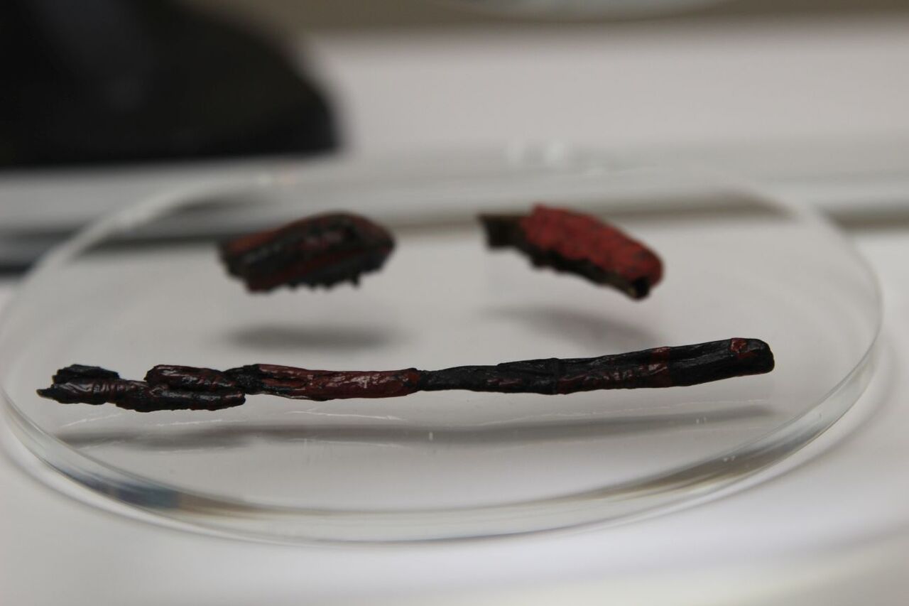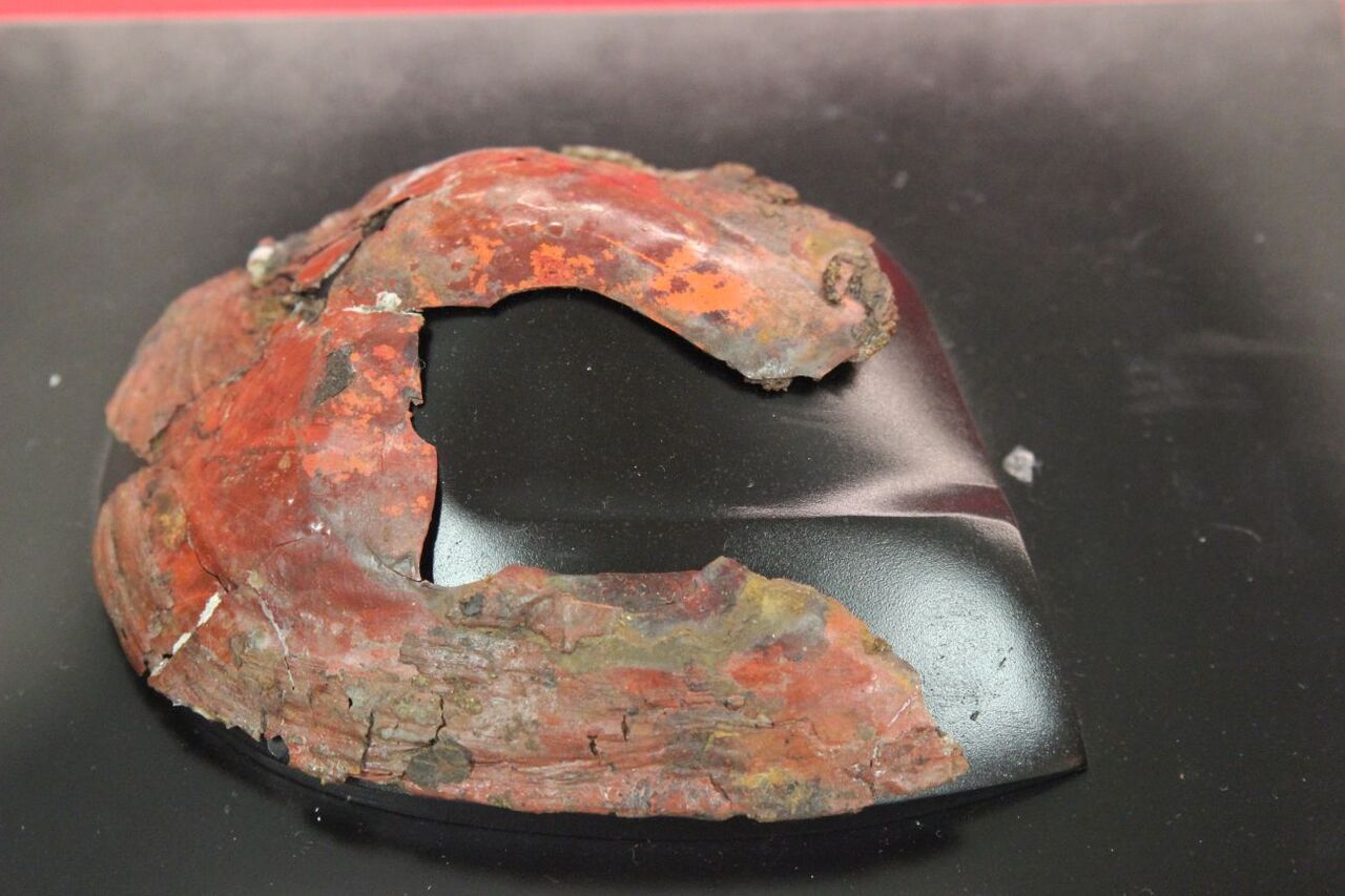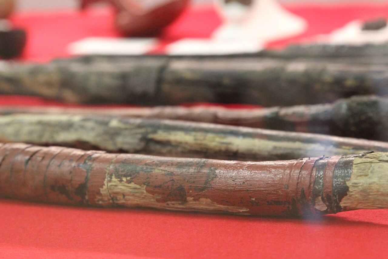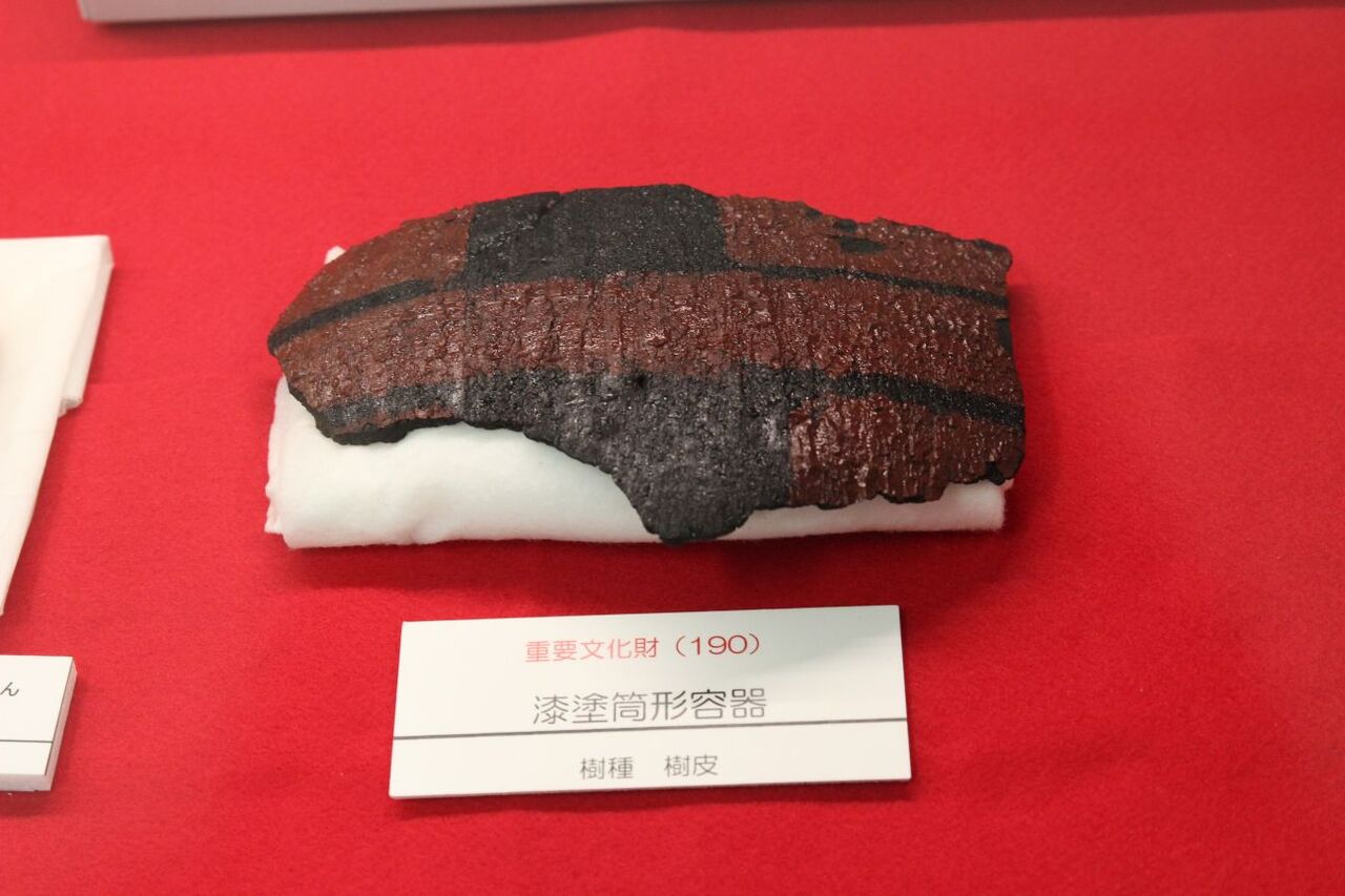 漆液容器(朱・ベンガラ漆)&漆塗筒形容器(樹皮)。漆をここ(八国山)で作っていた証拠の一つです。