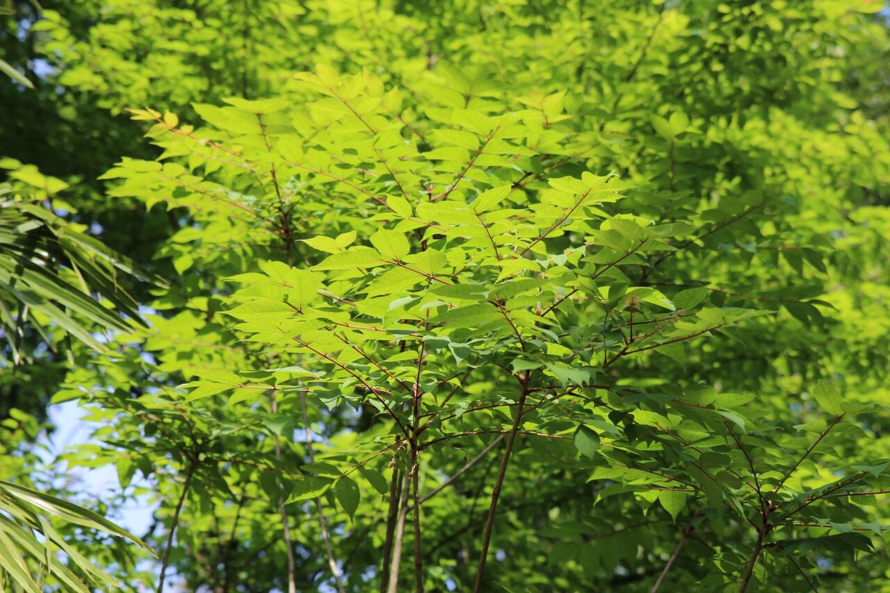 ヤマウルシ。ヌルデと違って、葉っぱがテーブル状に広がり。葉っぱにギザギザがありません。