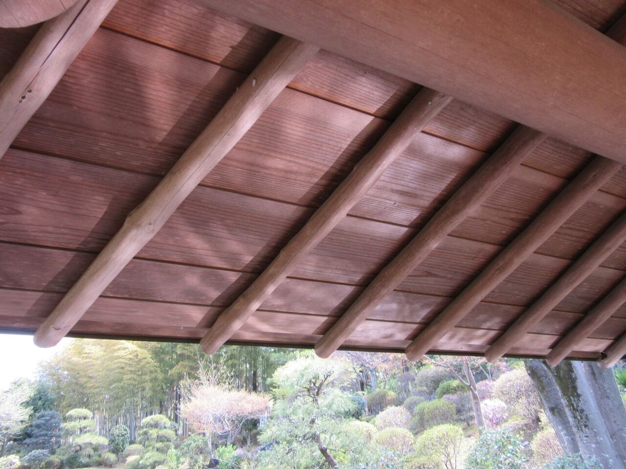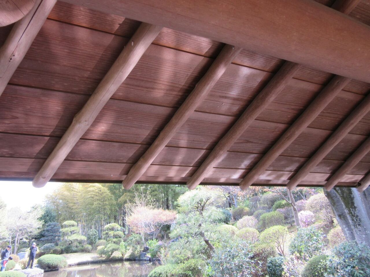 東屋の天井。池の水面が反射して、面白い模様を描いています。