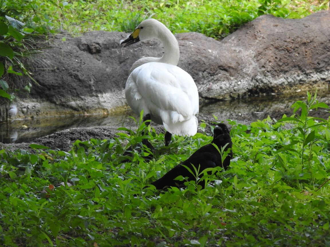 白鳥とカラス。白と黒の響宴?上野ではお互いに不干渉?不感症? 都会派ですね。